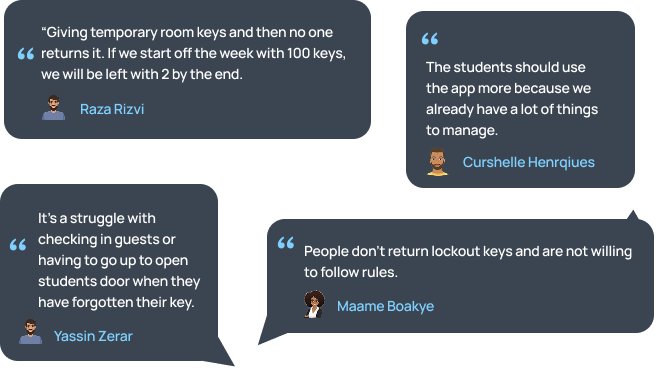 Lost or faulty key cards and forgotten keys lead to delays and lockouts. Replacements and temporary keys are costly and inconvenient. Staff spend significant time managing key issues. Weekly orders for temporary keys are additional expenses.