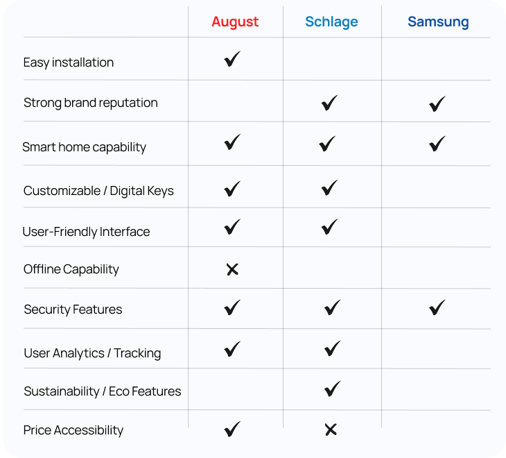 After conducting SWOT analyses of leading smart lock companies to identify their unique selling points and understand the competitive landscape, I proceeded to compare all three through a detailed competitive analysis to highlight key differentiators and market positioning.