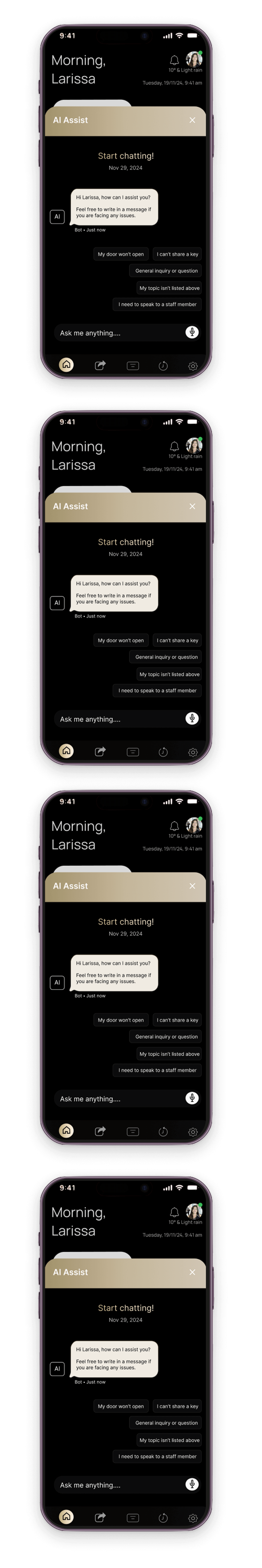 My logo design was inspired by the original black-and-gold key card from Chapter student accommodation, keeping the look consistent and authentic to its context. I aimed for a clean, minimalistic logo like those used by major brands that feels like a real, functional app icon. I am a fan of dark mode, naturally I gravitated toward a black base, avoiding excessive elements to maintain memorability.